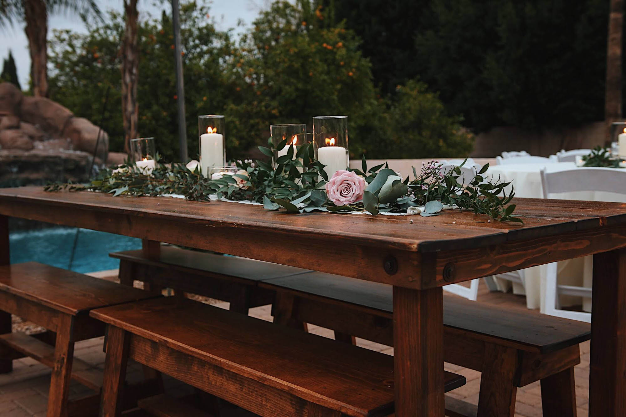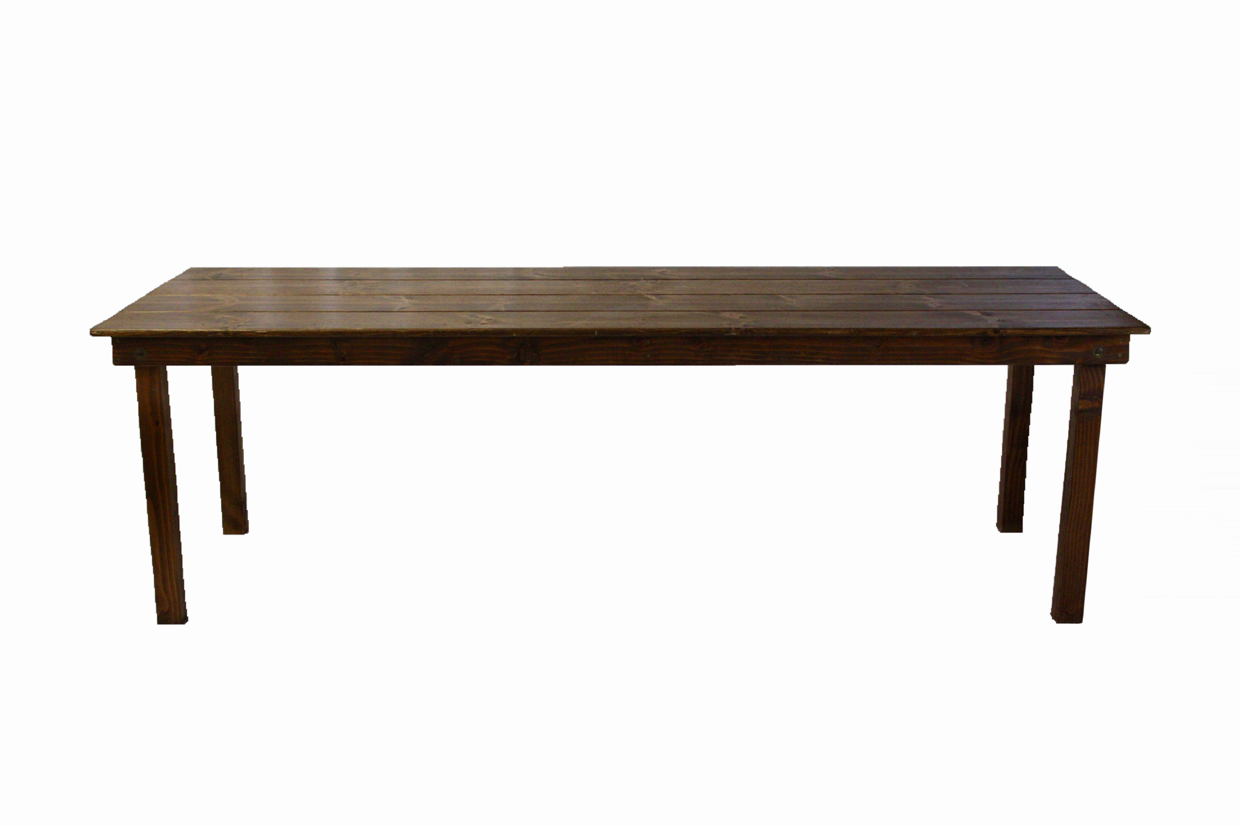 Wood-n-Crate's flagship inventory item! Our Classic Farm Table is masterfully crafted and maintained to provide your event a charming dining or seating experience. Wood-n-Crate's Farm Table is 8 ft long and 3 ft wide. This provides comfortable seating for 8 guests, or up to 10 if a chair is used at either end. Looking for an elegant spin on our Classic Farm Table? Ask about our French Country Table Legs!