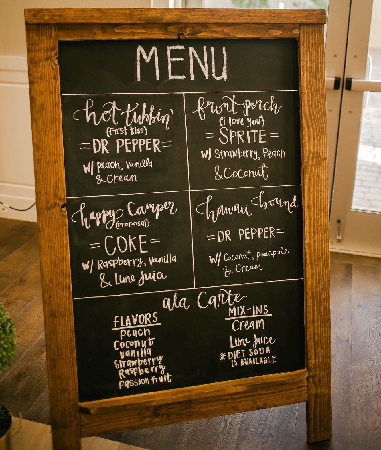 A fantastic chalkboard for any menu or announcement! Vinyl lettering is available at an extra cost.